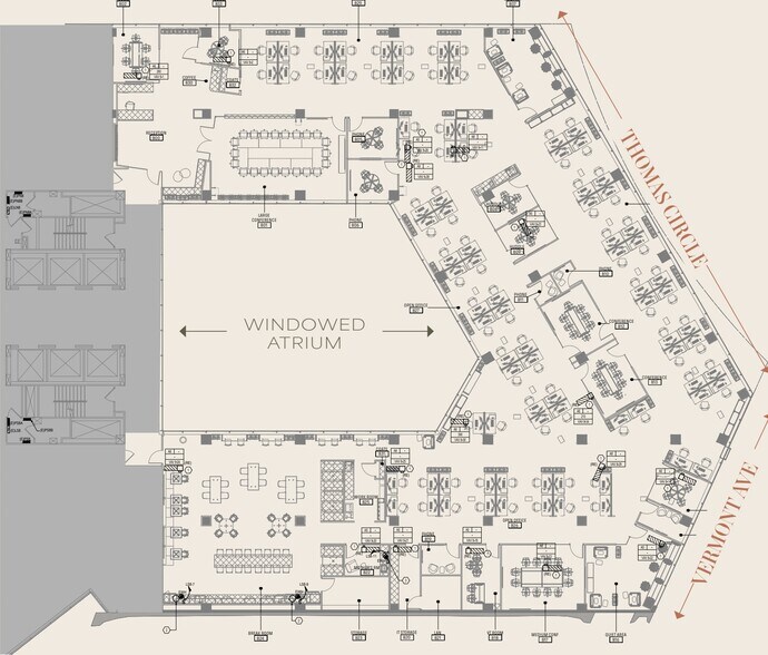 - Floor plan includes 90 sit/stand desks and 12 private meeting rooms or offices.