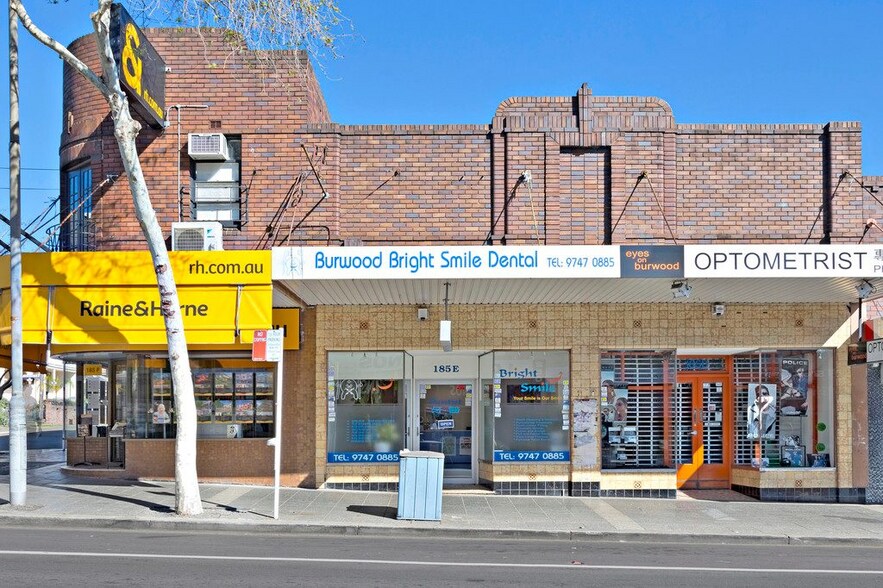185E Burwood Road is a retail property located on the western side of Burwood Road between Belmore Street and Livingstone Street in Burwood, NSW. The site includes rear lane access from Sym Lane. The property is within proximity to Burwood Station, major banks, and surrounding retail and commercial amenities.