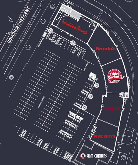 Boucher Square comprende 6 unidades que suman un total de más de 17,500 pies cuadrados de espacio para restaurantes y ofrece la principal oferta gastronómica informal de la zona. El programa cuenta con 132 plazas de aparcamiento gratuitas en el establecimiento y se puede acceder fácilmente a él desde Boucher Road.
