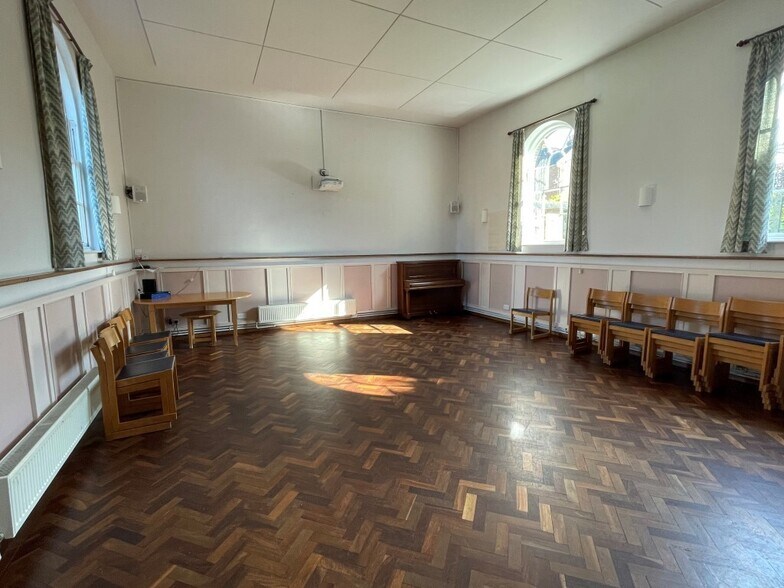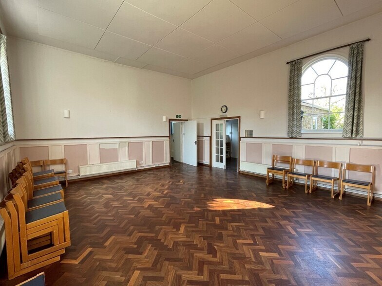 The building comprises a detached Grade II Listed Religious building all on one level constructed in 1818 with a large front and rear garden. The property is set back and is of solid brick walls under a pitched slate roof with attractive rounded arch sash windows at front and rear. There is a path externally providing disability access to a side door. Internally there are three steps up inside the main entrance to a small lobby with unisex and disabled persons WC. This then leads to a large main hall with high ceilings of approx 3.9m (12ft 11). There is a second, middle room and a kitchen to the right hand end, with rear door leading out to a garden at the back.