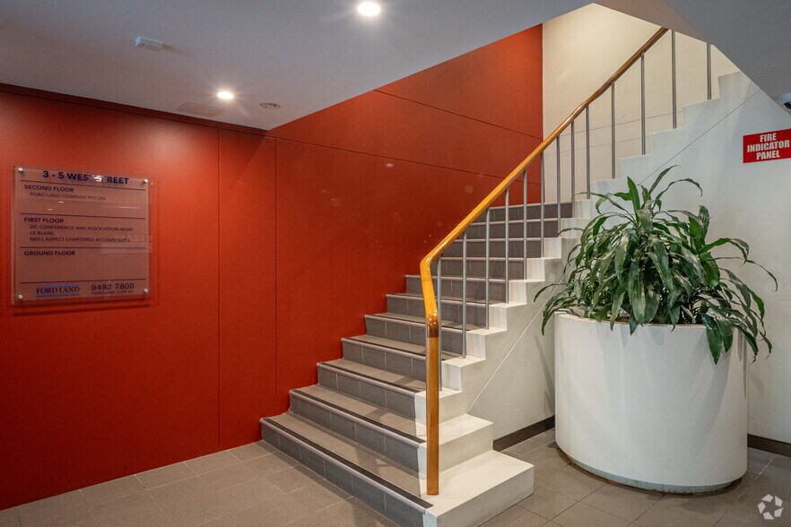 3-5 and 7-9 West Street is a three-level office building. The property includes internal amenities, a kitchen, boardroom facilities, and a rooftop deck. It is located near Victoria Cross Station and North Sydney Station, with proximity to local dining, childcare, gyms, and parks. Secure parking is available on-site.