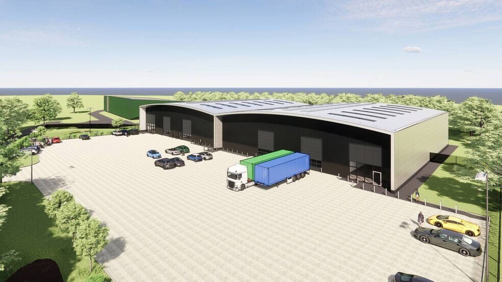 La especificación de cada unidad incluirá: - Dos puertas de carga operadas electrónicamente - Altura del alero de 8 m - Luces de techo translúcidas al 15% - Suelo de concreto - Paneles solares en el techo - Puntos de recarga para vehículos eléctricos - Suelos alfombrados sólidos para llegar a las oficinas - Techos suspendidos con iluminación LED empotrada - Calentadores perimetrales eléctricos - Refrigeración confortable