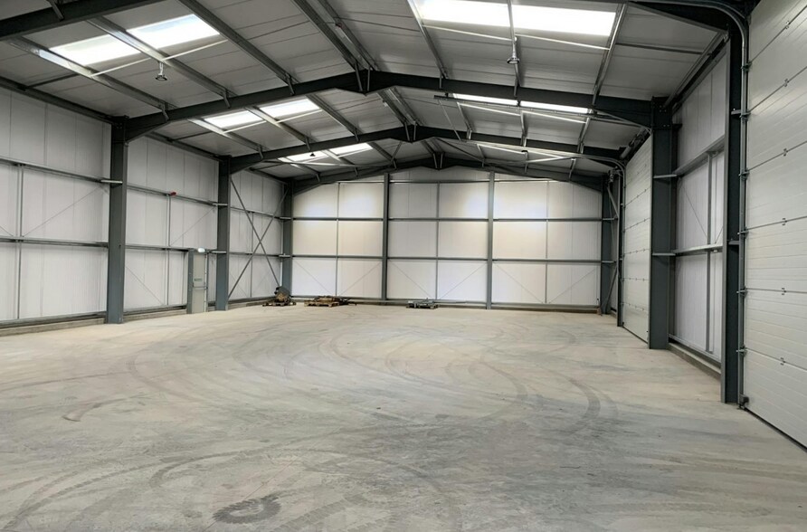The unit is newly constructed and situated at the rear of the site. The unit is of steel portal frame construction with composite steel cladding to roof and elevations. The internal eaves height is 5.75m. Two electric roller shutter doors & two personnel doors are provided. The unit has two separate service connections (capped off) and therefore could be subdivided. A small office and WC provision can be installed as part of the deal (subject to overall terms). Externally the units each have a concrete forecourt and shared access from Burrell Way.