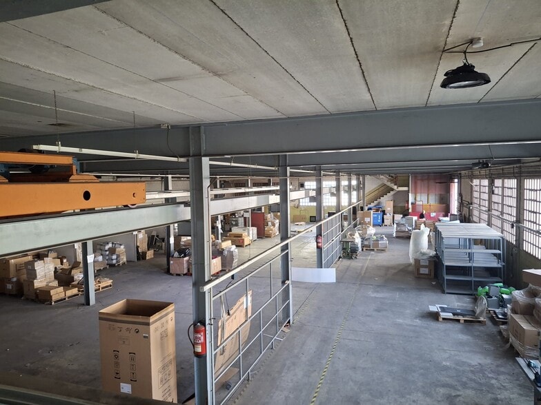 La planta baja alberga una amplia área de trabajo equipada con grúa puente para la manipulación de cargas pesadas. Cuenta con una altura libre de 4,09 m más 0,88 m, lo que facilita la operativa diaria. La planta primera dispone de cubierta a dos aguas, con una altura mínima de 2,50 m y una altura máxima cercana a los 5 m, y acoge espacios destinados a oficinas y otros usos complementarios.