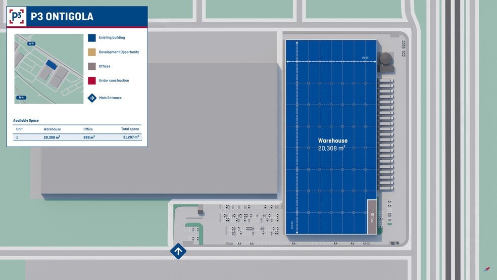 Inmueble logístico ubicado en el término municipal de Ontígola, en la provincia de Toledo, dentro de la Zona Centro, uno de los principales polos logísticos del sur de Europa. La localización se integra en el Tercer Anillo Logístico de Madrid – Zona Centro, a aproximadamente 50 km al sur de Madrid, con acceso rápido a los principales ejes de comunicación que conectan el eje sur de Madrid con el Corredor Mediterráneo. El inmueble se asienta sobre una parcela de 35.451 m2, que alberga una nave logística de categoría A con una superficie construida de 21.145 m2. El complejo cuenta con zonas de aparcamiento para turismos, equipadas con puntos de recarga para vehículos eléctricos, y ha sido concebido para operaciones logísticas de gran escala, así como para actividades de producción ligera, con posibilidad de funcionamiento 24/7. El entorno se caracteriza por un hub logístico consolidado, con presencia de compañías de referencia en sectores como retail, 3PL y distribución. La implantación de operadores de primer nivel, como Inditex, DHL o Iskaypet, refuerza el posicionamiento de Ontígola como enclave estratégico para la optimización de cadenas de suministro a escala regional y nacional. La localización dispone de accesos directos a la A-4 y R-4, así como a las autopistas AP-36 y A-40, lo que garantiza una conectividad eficiente tanto a nivel regional como nacional. El activo se sitúa a unos 35 minutos del centro de Madrid y a aproximadamente 40 minutos del Aeropuerto Adolfo Suárez Madrid-Barajas, facilitando la operativa logística y la distribución de última milla.