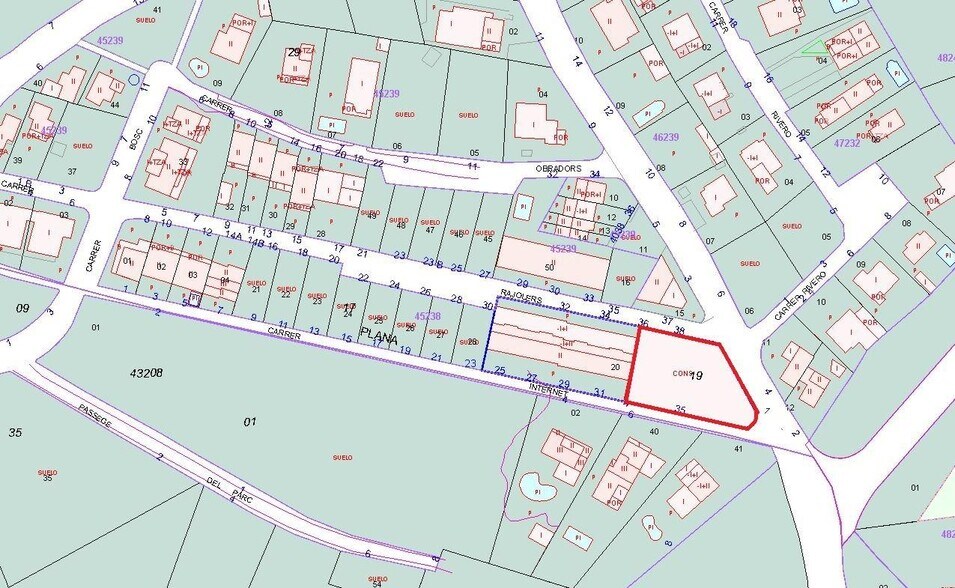 Suelo residencial situado haciendo esquina compuesto por 5 parcelas urbanas que permiten la construcción de edificios de planta baja y primera planta.