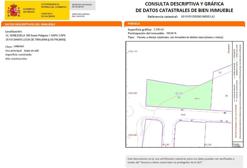 NO COBRAMOS COMISIÓN DE INTERMEDIACIÓN AL COMPRADOR ¡Desarrolla tu proyecto en un enclave estratégico del sureste de Gran Canaria! Presentamos este suelo urbano residencial ubicado en la localidad de Santa Lucía de Tirajana, en la provincia de Las Palmas, una de las zonas con mayor crecimiento y consolidación del sureste de Gran Canaria. -Superficie suelo: 2127.23m2s. -Edificabilidad: 2552.67m2c. -Uso predominante: Residencial -Estimación: Se pueden construir 23 viviendas adosadas compuestas por 3 plantas, 2 sobre rasante y 1 bajo rasante. Cada una de las plantas tiene una superficie de aproximadamente 55 m2, haciendo un total de 166.49 m2 construidos por vivienda. La planta bajo rasante está destinada a uso como garaje. -En este suelo existe una edificación en estado ruinoso de 450 m2 que habría que demoler para realizar el desarrollo de las viviendas unifamiliares. -Referencia catastral: 6519101DR5861N0001JU. La clasificación como suelo urbano permite proyectar viviendas unifamiliares, adosadas o incluso una pequeña promoción plurifamiliar, según normativa vigente. La parcela ofrece la posibilidad de diseñar un conjunto residencial moderno y eficiente, priorizando orientación, ventilación cruzada y aprovechamiento de la luz natural, elementos especialmente valorados en el clima canario. Ubicado en entorno urbano consolidado, el suelo se encuentra próximo a centros educativos, supermercados, centro de salud, instalaciones deportivas y zonas comerciales. Además, cuenta con excelente conexión a la GC-1, facilitando el acceso a Vecindario, Maspalomas, el aeropuerto y Las Palmas de Gran Canaria. Hipoges es una plataforma inmobiliaria donde podrás acceder a miles de activos inmobiliarios de diferentes tipos como viviendas, locales comerciales, terrenos, nueva obra, tanto a nivel particular como para inversores. Hipoges cuenta con una amplia cartera de activos inmuebles tanto en España como en Portugal y Grecia.