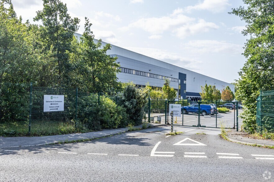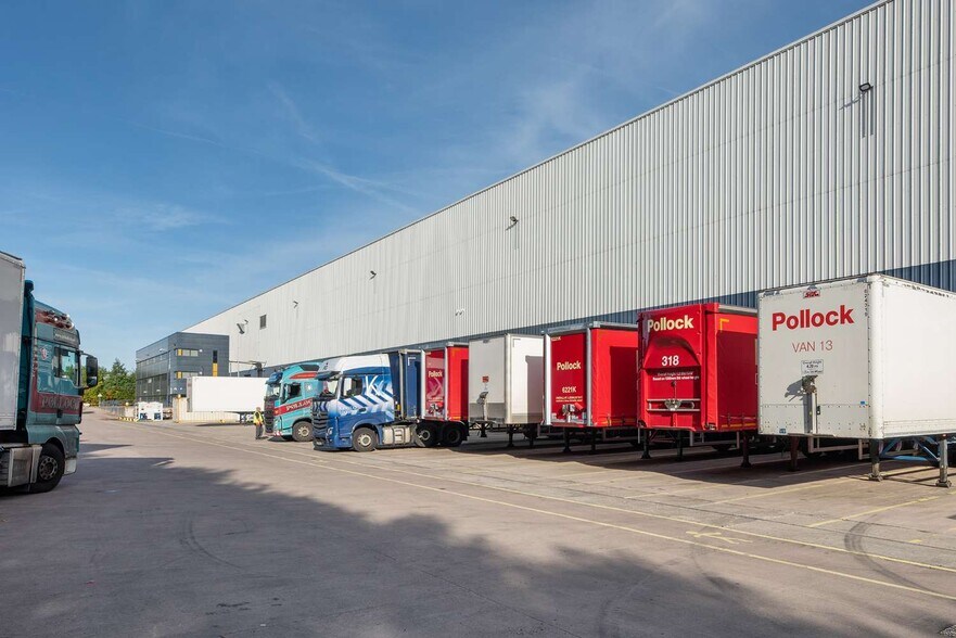 La propiedad comprende una moderna unidad de gran altura construida con estructura de portal de acero bajo un techo de chapa metálica de perfil aislante con claraboyas translúcidas. La unidad cuenta con un alero de 15 m de altura que se eleva hasta 18 m en el vértice, iluminación LED, una capacidad de carga de 65 kN/m², 28 puertas a nivel del muelle, puertas de acceso a 2 niveles y una importante fuente de alimentación de 4 MVA.