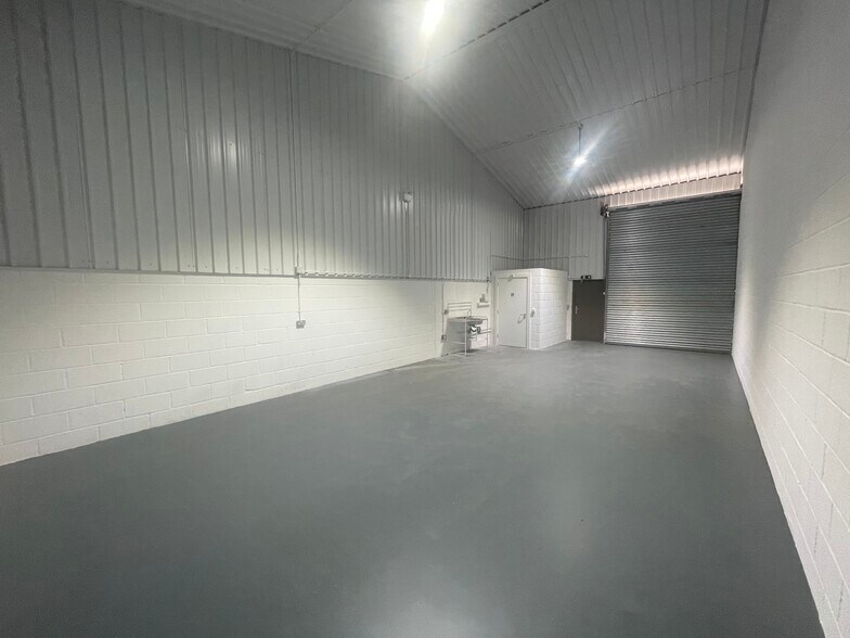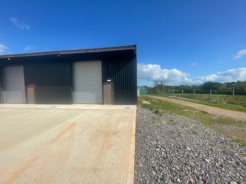The industrial unit is a refurbished farm building with profiled metal cladding, a plastic coated pedestrian security door, a roller shutter door, a concrete floor, LED lighting, WC facility and kitchenette.