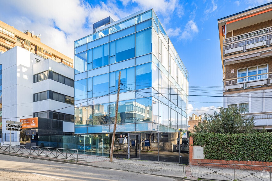 Ref. 24087 Espectacular edificio exclusivo de oficinas de reciente construcción ubicado en una zona inmejorable de Arturo Soria, donde convive entre edificios residenciales, exclusivos de oficinas y excelentes conexiones tanto al aeropuerto como al centro de Madrid, gracias a sus rápidos accesos a la avenida de América. Fachada de cristal que proporciona mucha visibilidad al interior del inmueble. Parking en tres plantas sótano.
