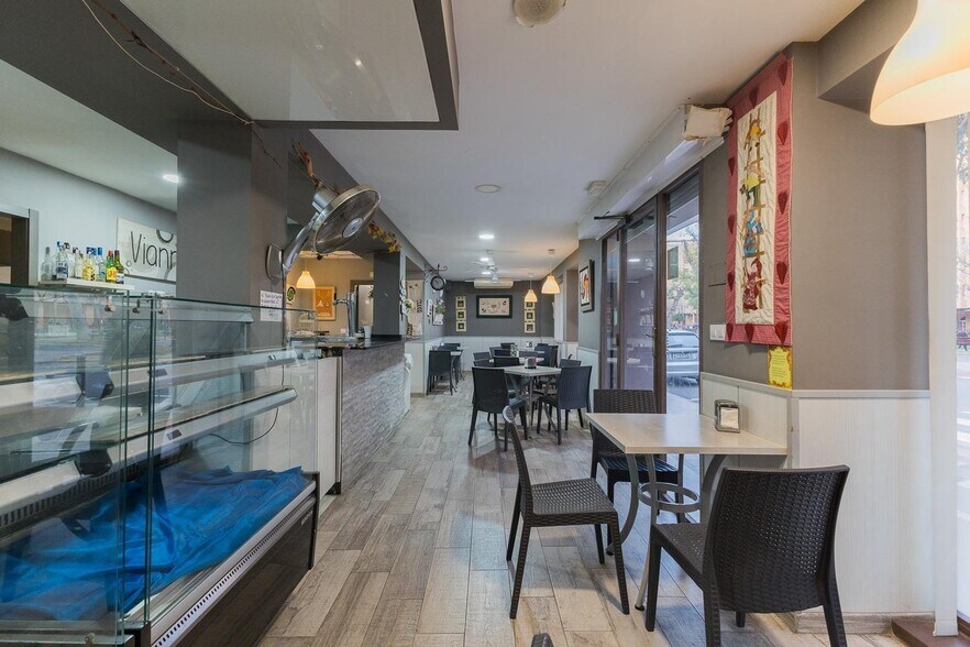 Local de 112 m2 construidos con licencia de actividad, escaparate, cocina equipada, aire acondicionado, persiana automática, insonorización completa (techos, paredes y pilares), sistema de renovación de aire, instalación independiente de gas ciudad y butano, descalcificador de agua en la entrada del local con sistema de ósmosis, instalaciones preparadas para continuar la actividad de forma inmediata, terraza exterior con 6 mesas y 20 sillas, dos patios de luces comunitarios, 1 aseo completo y 1 aseo adaptado para personas con movilidad reducida.