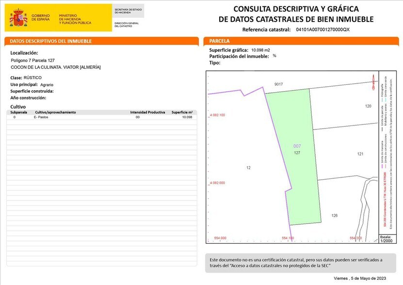 NO COBRAMOS COMISIÓN DE INTERMEDIACIÓN AL COMPRADOR Excelente oportunidad de adquirir en propiedad esta finca rústica de uso agrario con una superficie de 10.050m² ubicada en el Polígono 7 Parcela 127 COCON DE LA CULINATA; en la localidad de Viator, provincia de Almería. Se encuentra junto a la Autovía del Mediterráneo (E15) y próximo a los principales nudos de comunicación de la capital almeriense. Es ideal para tus proyectos agrícolas o ganaderos ya que el terreno se encuentra en una zona estratégica para la agricultura, conocida por su clima favorable y suelo fértil. -Referencia catastral: 04101A007001270000QX. Viator es una localidad y municipio español situado en la parte central de la comarca Metropolitana de Almería, en la provincia de Almería, comunidad autónoma de Andalucía. Limita con los municipios de Almería, Huércal de Almería y Pechina. Por su término discurre el río Andarax. En esta localidad se encuentra la Base Álvarez de Sotomayor de la Legión Española. Viator se encuentra en un entorno que combina tanto áreas rurales como urbanas. A pesar de ser un municipio relativamente pequeño, ofrece un ambiente tranquilo y apacible para aquellos que buscan escapar del ajetreo de las áreas urbanas más grandes. Cuenta con una infraestructura básica y una buena variedad de servicios. Se encuentra cerca de la autovía A-7. Además, cuenta con una estación de tren que ofrece conexiones con Almería y otras ciudades de la provincia. No lo dudes, invertir en el suelo que te ofrecemos será una apuesta segura. Hipoges es una plataforma inmobiliaria donde podrás acceder a miles de activos inmobiliarios de diferentes tipos como viviendas, locales comerciales, terrenos, nueva obra... tanto a nivel particular como para inversores. Hipoges cuenta con una amplia cartera de activos inmuebles tanto en España como en Portugal y Grecia.