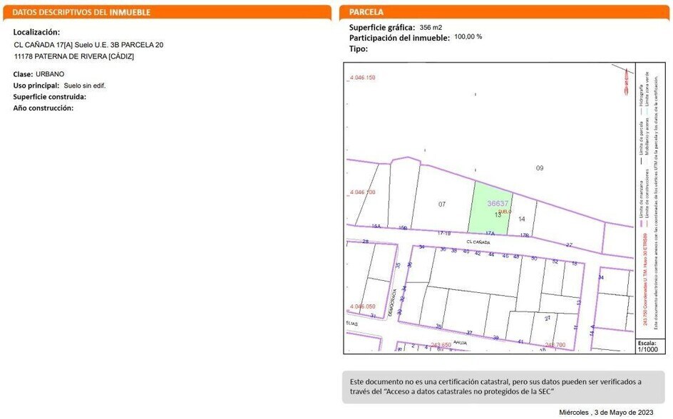 Nos complace anunciaros que este activo está dentro de una campaña de Gastos notariales de Compraventa. El vendedor se hará cargo de parte de los costes si la Compraventa se produce en 2024... Se vende Suelo Urbano, con una mejora de edificación en la localidad de Paterna de Rivera, en la provincia de Cádiz, a pie de carretera, zona tranquila y con bonitas vistas a la campiña, cuenta con 356 m2 de superficie aproximadamente... Al ser suelo urbano lleva 21% de IVA directo, el cual se añadirá a los gastos de compra venta... El precio no tiene incluido aquellos gastos que por Ley le pudiera corresponder a la parte adquirente, tales como ITP, IVA, Notaría y Registro... Esta propiedad NO se puede ver interiormente, pero si conocer su ubicación exacta y características detalladas (no disponemos de fotos del interior)... IKESA es una agencia homologada de diferentes Entidades Financieras, Fondos de Inversión, Servicies, disponemos de una amplia cartera de Activos Inmobiliarios,