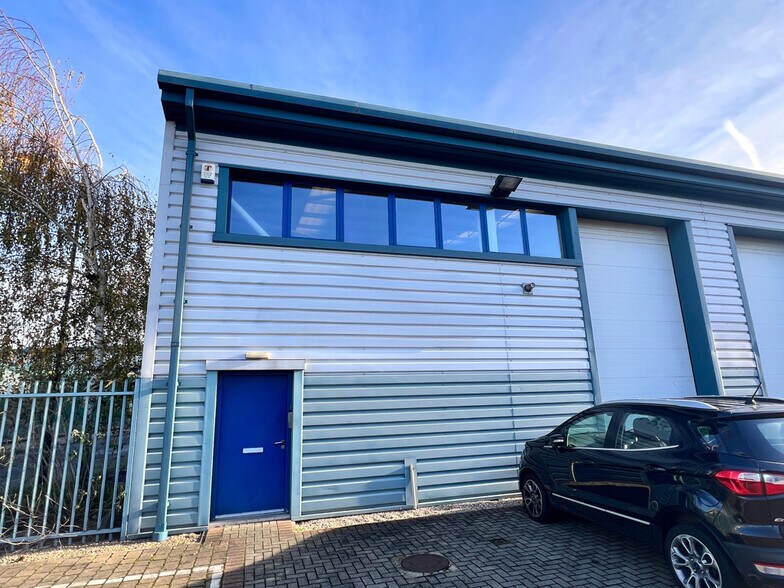 An end-of-terrace modern steel portal frame unit featuring high quality air-conditioned office space.