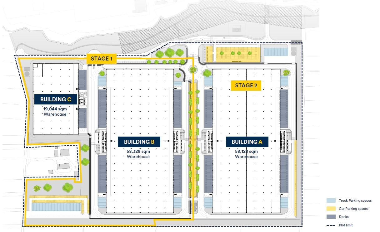 Almacén logístico de 58.328 m² ubicado en un parque logístico que consta de un total de tres edificios. Cuenta con 76 muelles de carga, 180 plazas de aparcamiento y espacio para 43 camiones.